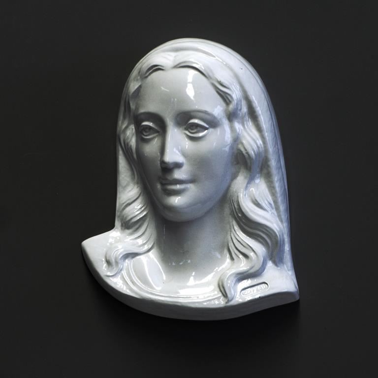 Hlava Panny Marie, bílá plastika malá. Plastika hlavy Panny Marie má šířku 10 cm a výšku 13 cm a lze ji umístit na rakev, hrob, hrobovou desku, pomník nebo kříž. Plastika je odolná povětrnostním vlivům.