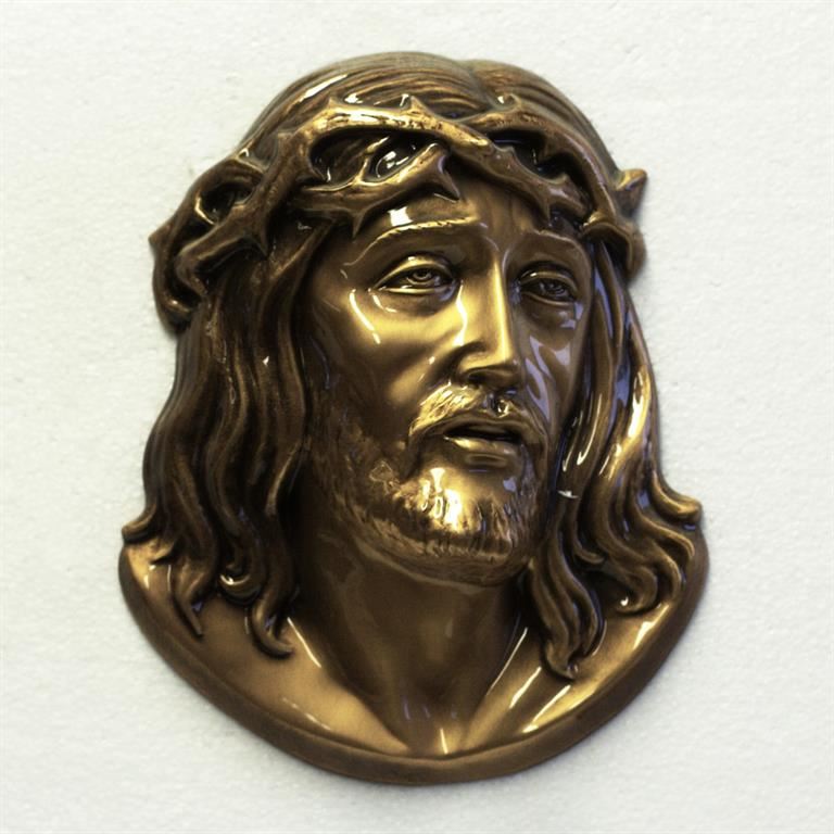 Kristova hlava, bronzová plastika velká. Plastika hlavy Krista má šířku 16 cm a výšku 20 cm a lze ji umístit na rakev, hrob, hrobovou desku, pomník nebo kříž. Bronzová plastika je odolná povětrnostním vlivům.