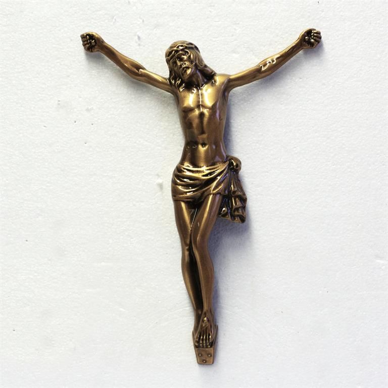 Bronzová plastika Krista malá. Soška Krista má výšku 26 cm a využití například na rakev, hrob, hrobovou desku, pomník či kříž.