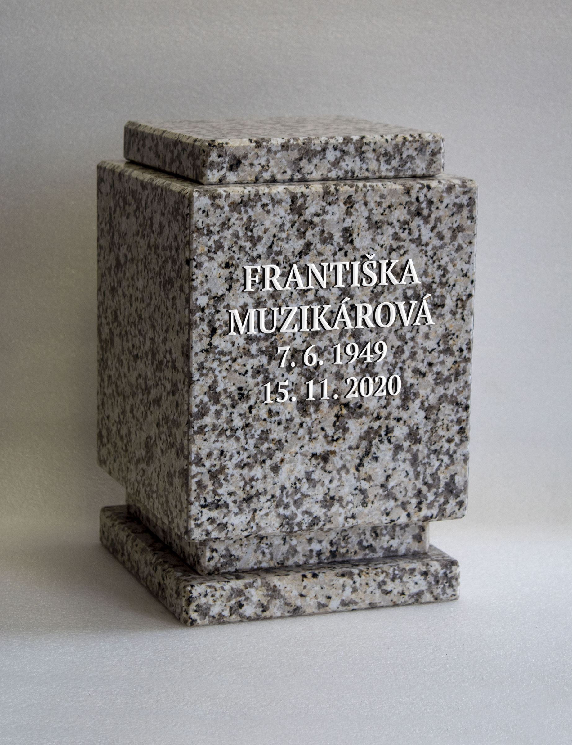 Hranatá kamenná urna s nápisem, žula Giallo Sardinia