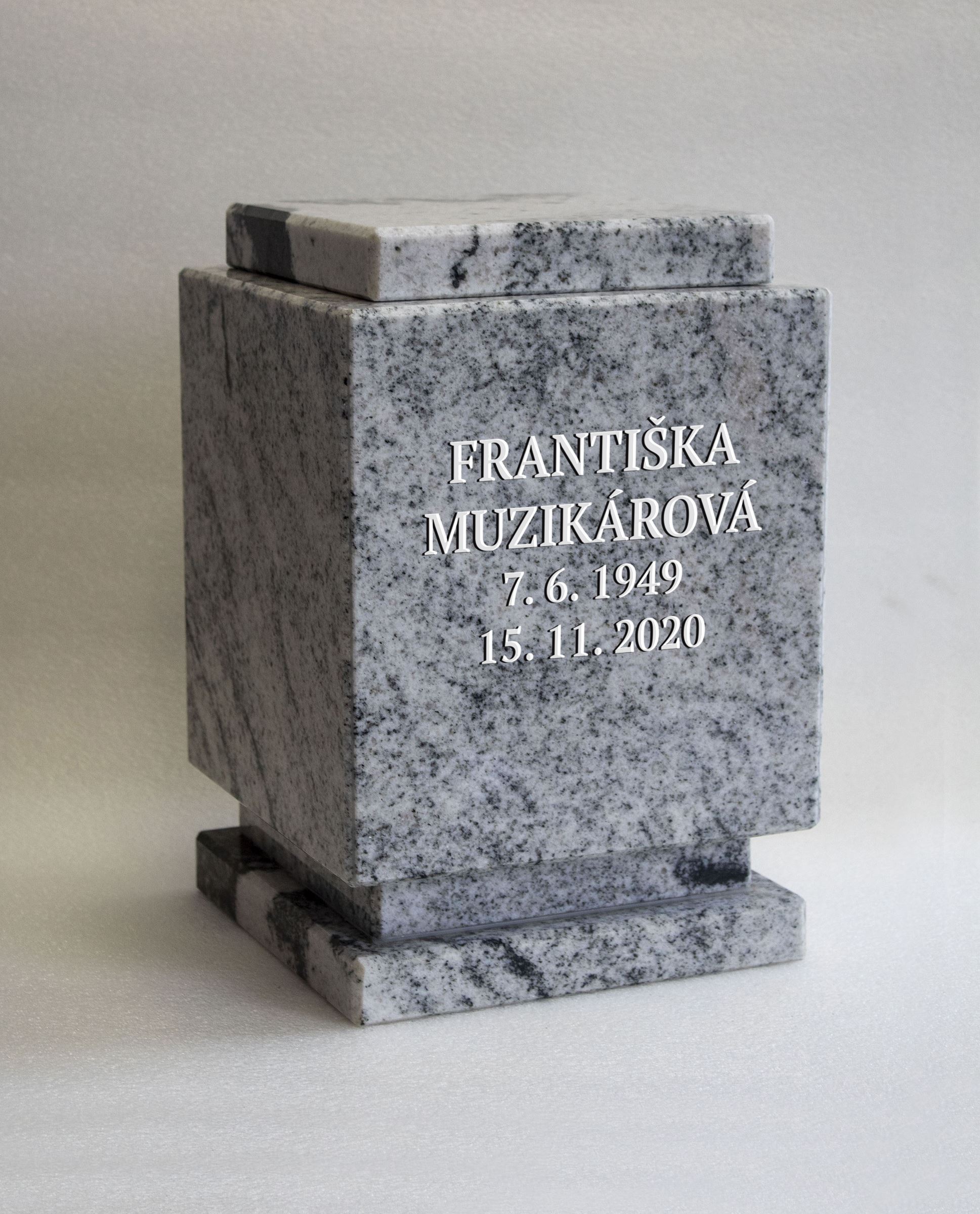 Hranatá kamenná urna s nápisem, žula Viscont White