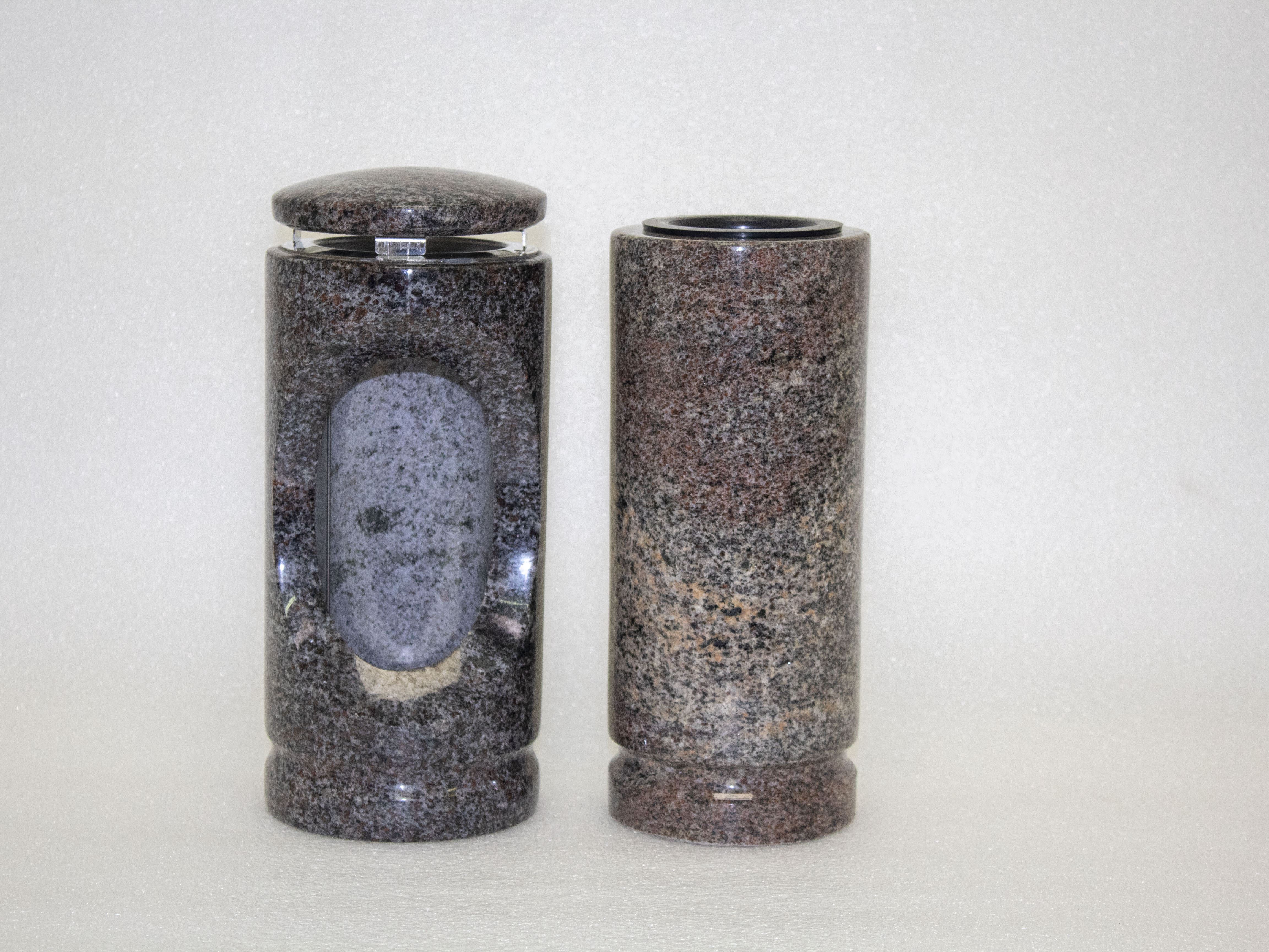 Sada kamenná svítilna a váza z přírodního kamene – žuly, typ ovál širší je určená na pomník nebo hrob.