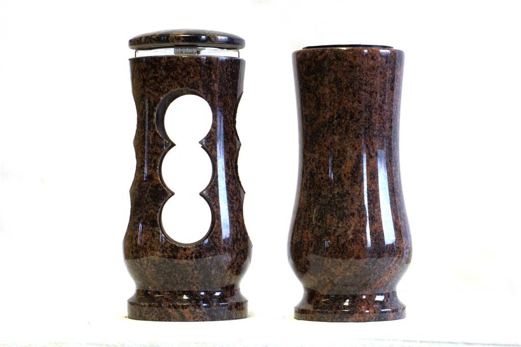 Sada kamenné svítilny a vázy určená na pomník nebo hrob. Komplet je možné objednat v provedení z kamene Aurora nebo Černá žula. Typ kamene zvolte na této stránce vedle hlavní fotografie kompletu vpravo nahoře.
