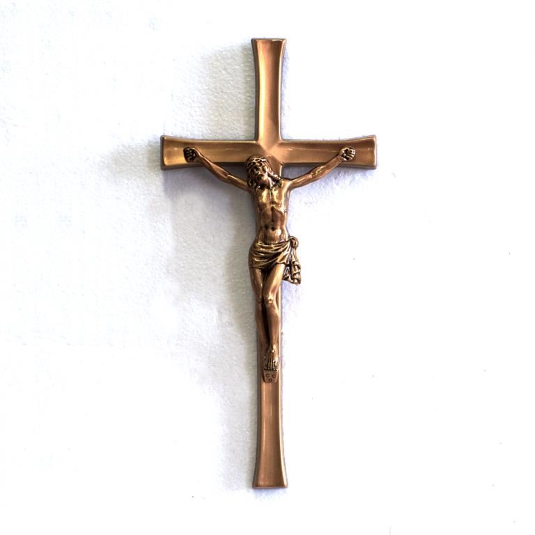 Křížek bronzový širší s Kristem. Bronzová plastika křížku s Kristem je vysoká 25 cm.