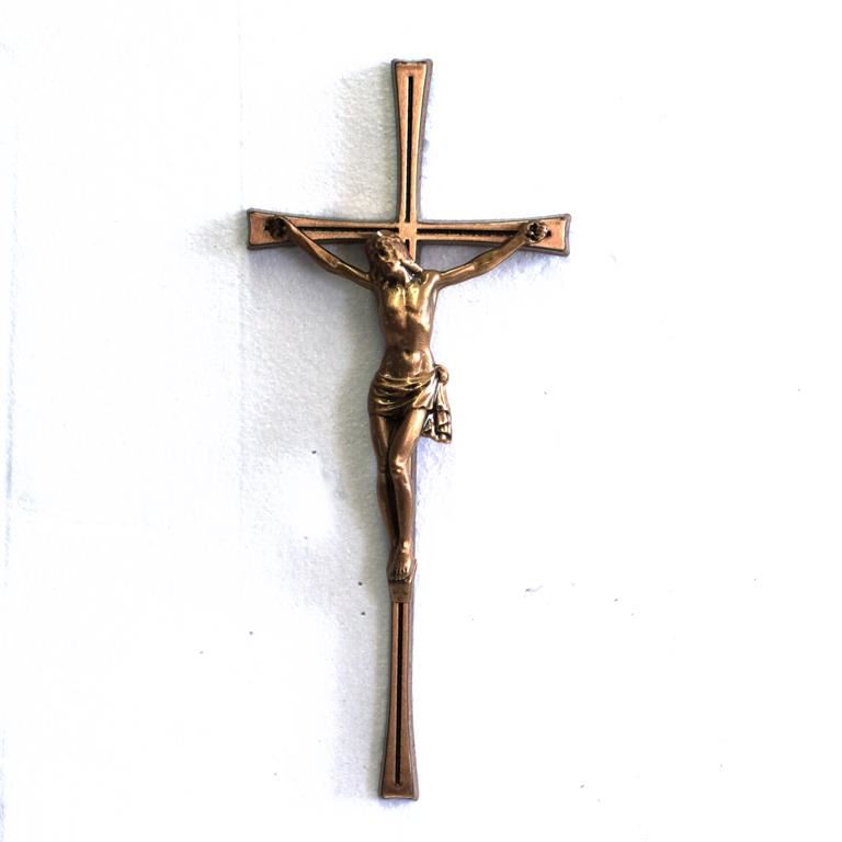 Křížek bronzový úzký s Kristem. Bronzová plastika křížku s Kristem je vysoká 25 cm.