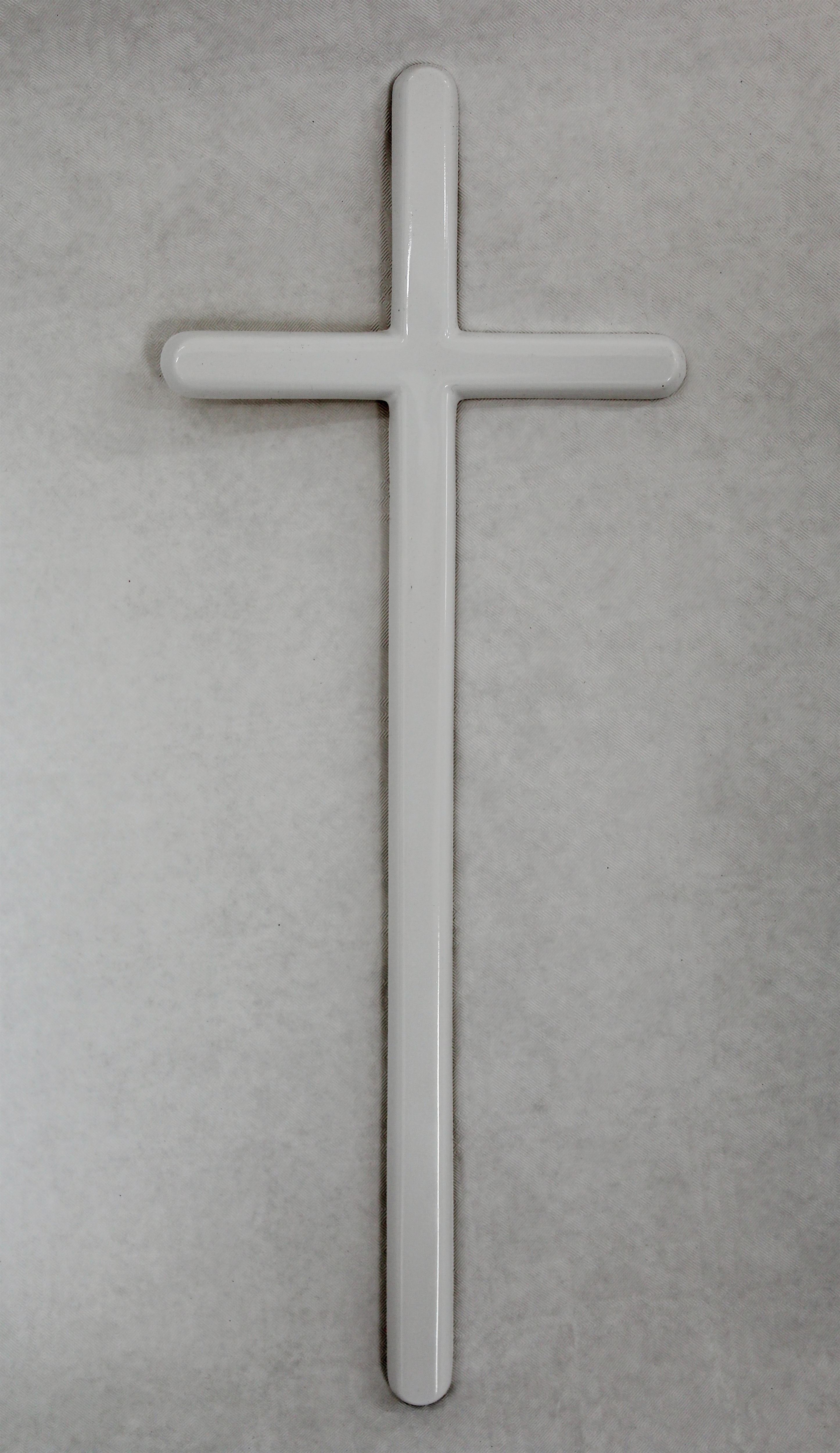 Křížek z pryskyřice, povrchová úprava bílá. Výška křížku je 40 cm, šíře je 14,5 cm.