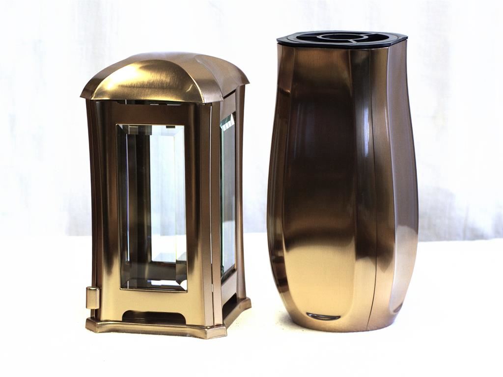 SET kovová lampa a váza na hrob v luxusním provedení s povrchovou úpravou stylu bronz. Rozměry lampy jsou 12,8 cm šířka a výška 24,5 cm, váza má rozměry 11,5 cm na šířku a 25,5 cm výšku. Kovovou lampu i vázu v provedení bronz je možné zakoupit v tomto setu nebo samostatně v tomto e-shopu v sekcích „Hřbitovní vázy" a “Náhrobní lampy. Do náhrobní lampy je možné vložit a zapálit v ní smuteční svíčky maximálně do výšky 5 cm. Při použití vyšších svíček hrozí poškození lampy plamenem.