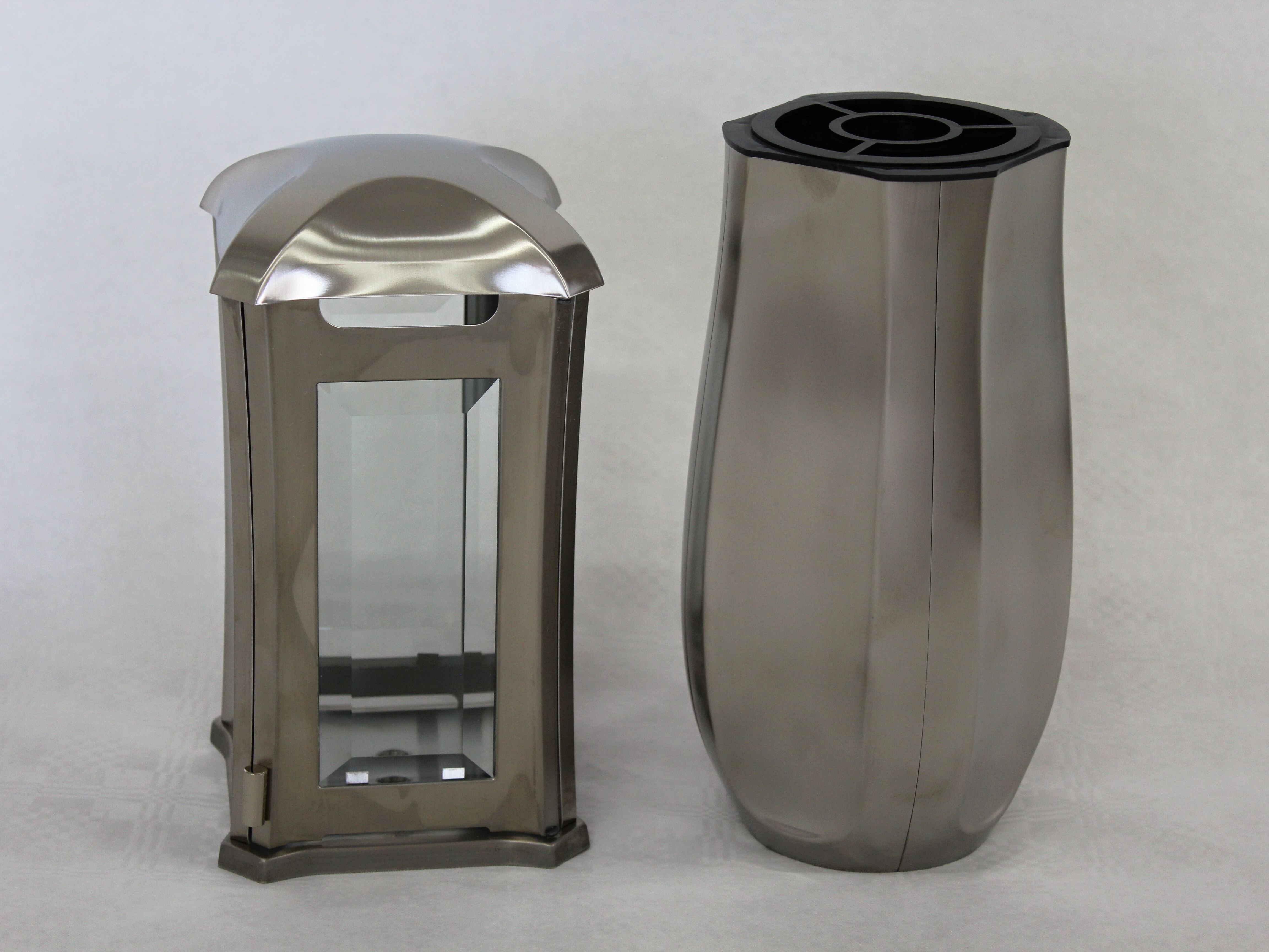 Komplet kovová lampa a váza na hrob s povrchovou úpravou nerez.