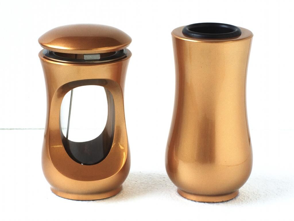Set smuteční lampa a váza na hrob jsou vyrobeny ze speciální pryskyřice s povrchovou úpravou imitující zlato.