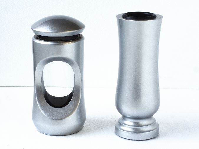 Set smuteční lampa a váza na hrob jsou vyrobeny ze speciální pryskyřice s povrchovou úpravou imitující stříbro.