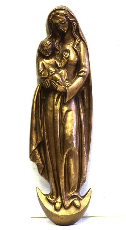 Bronzová plastika Madony. Výška plastiky je 47 cm a šířka 13 cm. Smuteční a náhrobní plastiky z bronzu jsou velmi odolné povětrnostním vlivům a snadno se udržují.
