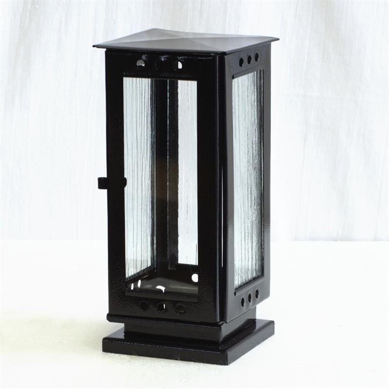 Náhrobní lampa/svítilna kovová černá čistá. Lampá má rozměry 10,2 cm na šířku a 23 cm na výšku. Lampu je možné postavit na pomník nebo hrob. Do náhrobní lampy je možné vložit a zapálit v ní smuteční svíčky maximálně do výšky 5 cm. Při použití vyšších svíček hrozí poškození lampy plamenem.