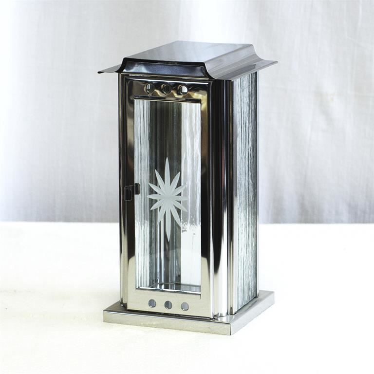 Nerezová náhrobní lampa pagoda broušená. Lampá má rozměry 11,6 cm šířku a 22,5 cm výšku. Lampu je možné postavit na pomník nebo hrob. Do náhrobní lampy je možné vložit a zapálit v ní smuteční svíčky maximálně do výšky 5 cm. Při použití vyšších svíček hrozí poškození lampy plamenem.