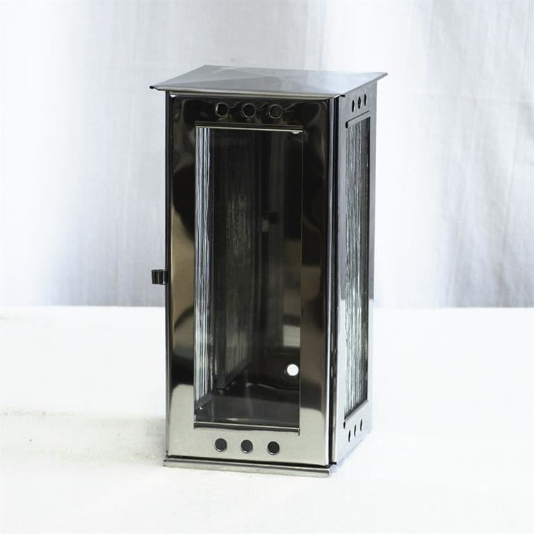 Závěsná náhrobní nerezová lampa hladká bez motivu. Rozměry lampy jsou 9,5 cm na šířku a 20,5 cm na výšku. Závěsná tyč není součástí této nerezové lampy. Lampu je možné zavěsit na pomník nebo hrob. Do náhrobní lampy je možné vložit a zapálit v ní smuteční svíčky maximálně do výšky 5 cm. Při použití vyšších svíček hrozí poškození lampy plamenem.
