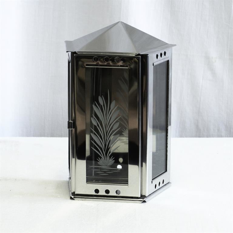 Závěsná náhrobní nerezová lampa broušená. Rozměry lampy jsou 14,7 cm na šířku a 23,5 cm na výšku. Závěsná tyč není součástí této nerezové lampy. Lampu je možné zavěsit na pomník nebo hrob. Do náhrobní lampy je možné vložit a zapálit v ní smuteční svíčky maximálně do výšky 5 cm. Při použití vyšších svíček hrozí poškození lampy plamenem.