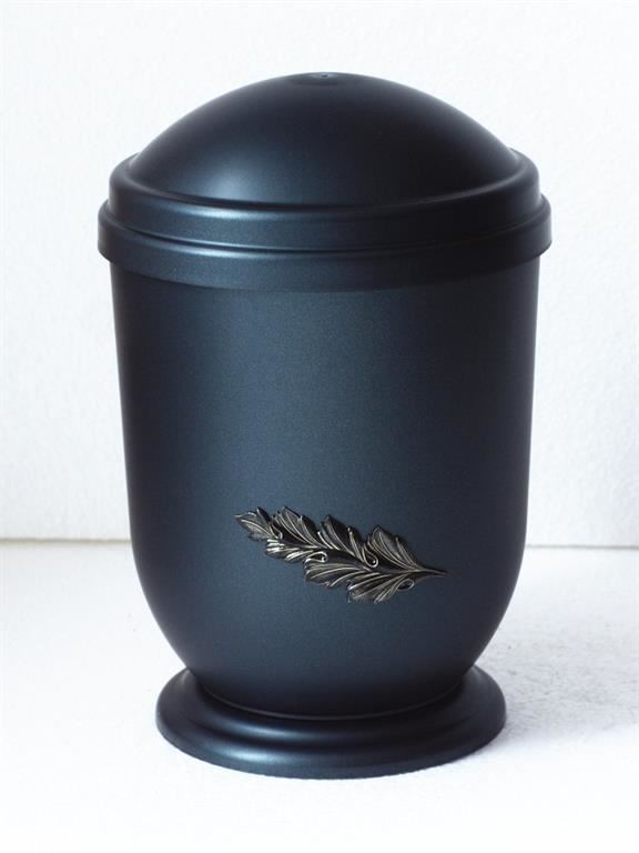 Plastová pohřební urna, urnový obal s ratolestí nebo růžičkou s tmavě šedou povrchovou úpravou.