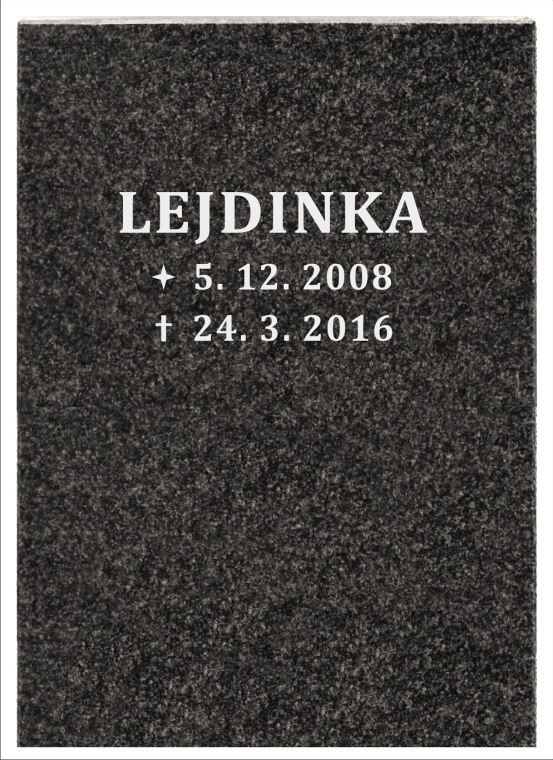 Náhrobky pro zvířata – psy, kočky, ptáky atd. vyrábíme ze dvou tmavých typů žuly, a to buď z ultrajemnozrnné žuly Supreme Black nebo z žuly Impala se znatelnější kresbou zrna. Náhrobek má rozměr 25 x 35 cm o síle kamene 3 cm, ze tří stran jsou hrany náhrobku hladké a leštěné. Ve čtvrté, spodní straně jsou vyvrtány dva otvory pro kovové trny (čepy), které slouží k upevnění pomníku do kamenného nebo betonového podstavce. Ocelové trny jsou součástí dodávky náhrobku pro zvířata. Na požadavek v poznámce můžeme ve stejné ceně místo otvorů pro čepy spodní hranu pomníku také vyleštit, například pokud budete chtít náhrobek položit na zem.